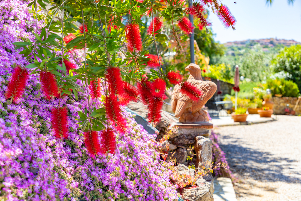 CAMPING VILLAGE Tutte le unità abitative sono distribuite sui vari terrazzamenti o nelle colline che avvolgono il camping in un contesto ampio e unico, immerse nel verde o adiacenti al parco piscina, alcune nel giardino botanico che si estende per circa 2 ettari, tra piante dai colori esotici, profumi mediterranei, rigogliose palme, come la palma azzurra, specie di piante e fiori tropicali molto rari. Dista circa 10 ..
