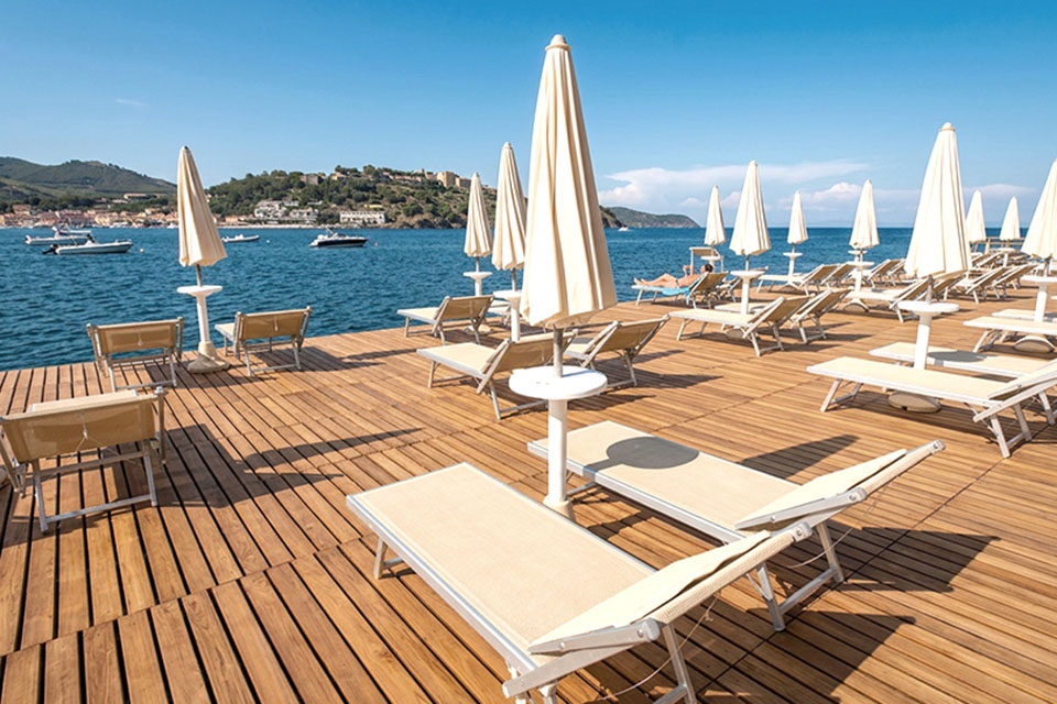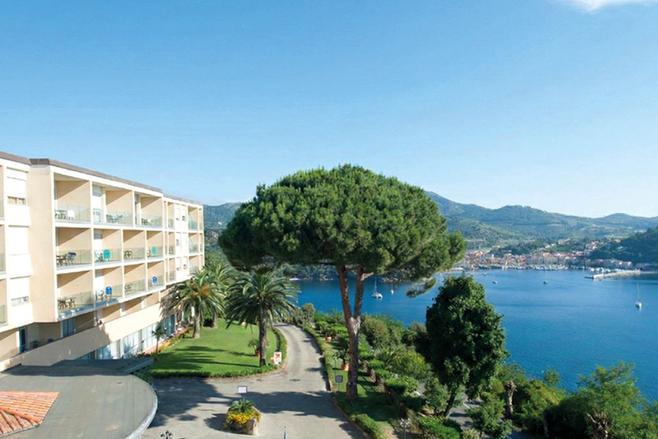 HOTEL 85 CAMERE Situato in zona privilegiata di fronte alla città Medicea di Portoferraio dalla quale dista circa 3 km, è immerso nel verde di un grande parco di 30.000 mq che si estende fino al mare. , SPIAGGIA PRIVATA servizio gratuito. Di fronte alla struttura si trova il lido di sabbia riportata dove i clienti avranno a disposizione 1 ombrellone + 2 lettini a camera, i teli mare sono gratuiti (prima fornitura) ..