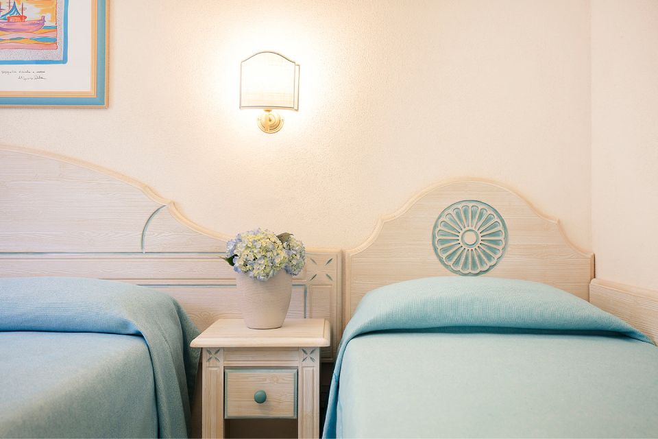 LE CAMERE La maggior parte con balcone, sono arredate in elegante stile sardo dai colori pastello e dotate di bagni moderni rivestiti in marmo e autentica cera sarda. Dispongono di tv, climatizzatore, mini bar (riempimento a pagamento), cassaforte, telefono, macchina da caffè a cialde, servizi con box doccia e asciugacapelli, set di cortesia. Le camere si suddividono in Classic e Superior. Le Classic al piano terra con vista giardino possono essere doppie/matrimoniali e triple, le Superior con Balcone, come le Classic ma ubicate ai piani alti, mentre le Vista Mare possono essere a piano terra con patio attrezzato o ai piani alti con balcone, e sono solo doppie o matrimoniali. Sono inoltre disponibili camere Family composte da due camere comunicanti con letti sempre bassi ed un unico servizio, e possono ospitare fino a 5 persone.
